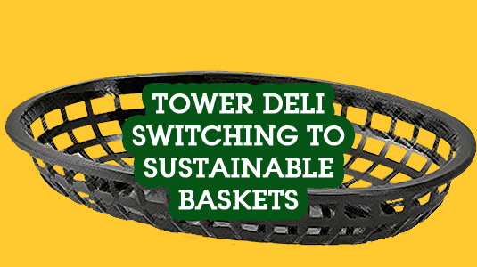 Stevenson Tower Deli is implementing yet another way to become more sustainable: Old "For Here" paper baskets will be replaced with plastic reusable baskets (Paper baskets will still be available for "To Go" orders).