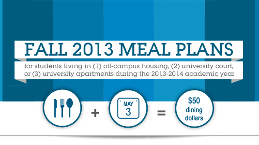 Sign up for an off-campus or apartment meal plan by May 3, 2013 and we’ll give you $50 in Dining Dollars to add to your Panther Card for the upcoming Fall 2013 Semester! Offer valid for current EIU students only.