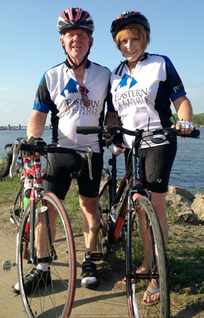 John Looby, who had ridden RAGBRAI in 2012, helped us turn the jersey project into reality. In 2014 my husband, John, was wearing his new EIU jersey, looking for a water connection for our RV, when a lady approached him asking where he had gotten his shirt, as her husband was an EIU alum. We were equipped to provide a jersey to Joe Davis, who at that time held the record for the most yards gained by an EIU quarterback in a single football game. He was so delighted with his jersey that he wore it every day for the remainder of RAGBRAI week. We also sent one to the gentleman who had worn the magic marker EIU on his tank top. Every year we find alumni and friends or relatives of someone who has attended EIU; they always have positive comments about our school and it is always fun to learn who they are, where they work, and what memories they have of our great institution.
