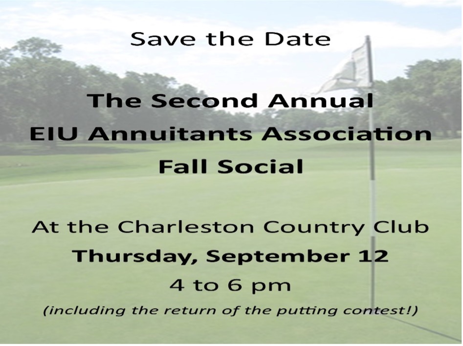 Mark your calendars now! The EIUAA Second Annual Fall Social will be held Sept. 12, 2024, from 4-6 p.m. at the Charleston Country Club. More details will be available soon, but I hear the putting contest will be returning!! Watch the EIUAA website, email communications, and/or the EIUAA Facebook page.