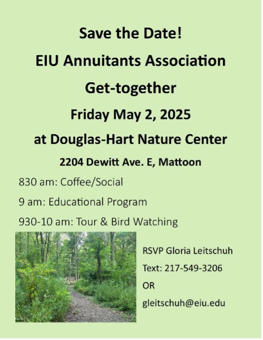Information and reminders of upcoming events are posted on our website and our Facebook group, Eastern Illinois University Annuitants Association. We hope to see you at our event on May 2nd at Douglas-Hart Nature Center. It should be a great way to enjoy Spring!