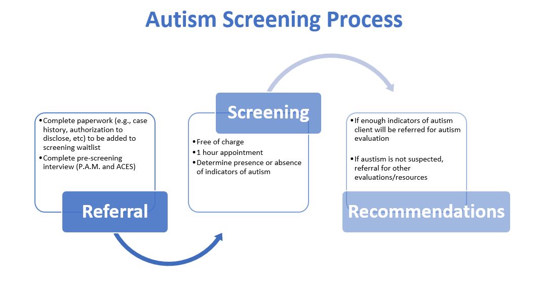 Referrals for an evaluation can come from a medical professional or be self-referral. The multi-disciplinary team evaluations are for initial diagnostic evaluations, not for reevaluations and/or second opinions. The process starts with a screening. Once a referral is made and the family completes required paperwork an individual is placed on a wait list to be screened. The estimated time from referral to completion of the evaluation is approximately a year to a year and a half.