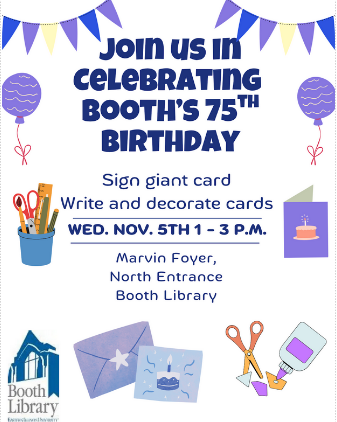 Come celebrate Booth Library's 75th Birthday! Join us to sign a giant card, or make your own birthday card, sharing what you love about Booth and how it has helped you while at EIU. Art supplies will be provided, so show your appreciation for Booth Library on November 5th from 1-3 in the Marvin Foyer (the North entrance- near the Union!)