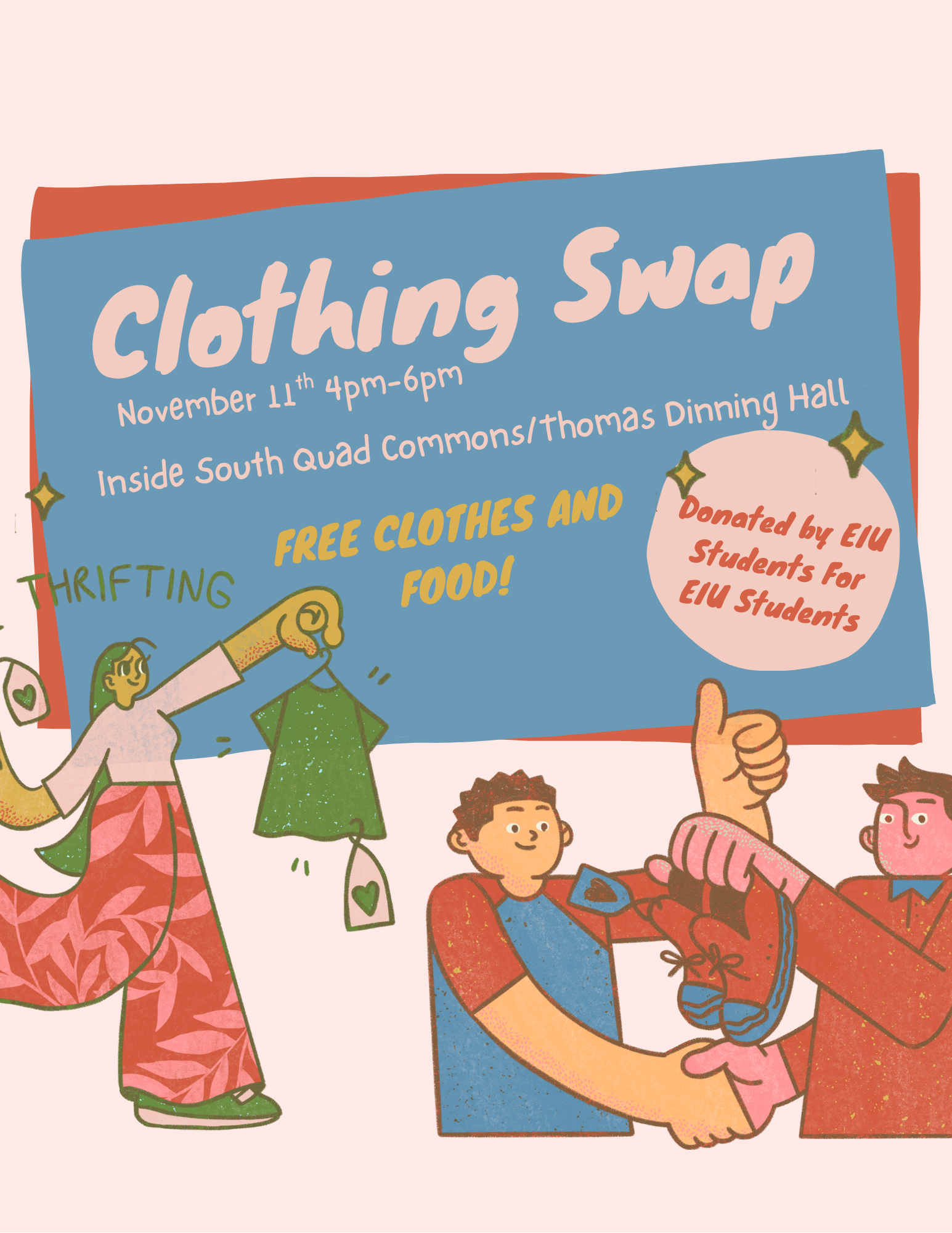 Help recude clothing waste on EIU's campus by participating in a clothing swap! Gently used clothes and plastic bags were donated by students in all residents halls and the library for a free thrifting event! Participants are able to take as many clothes as fit in a bag for free!