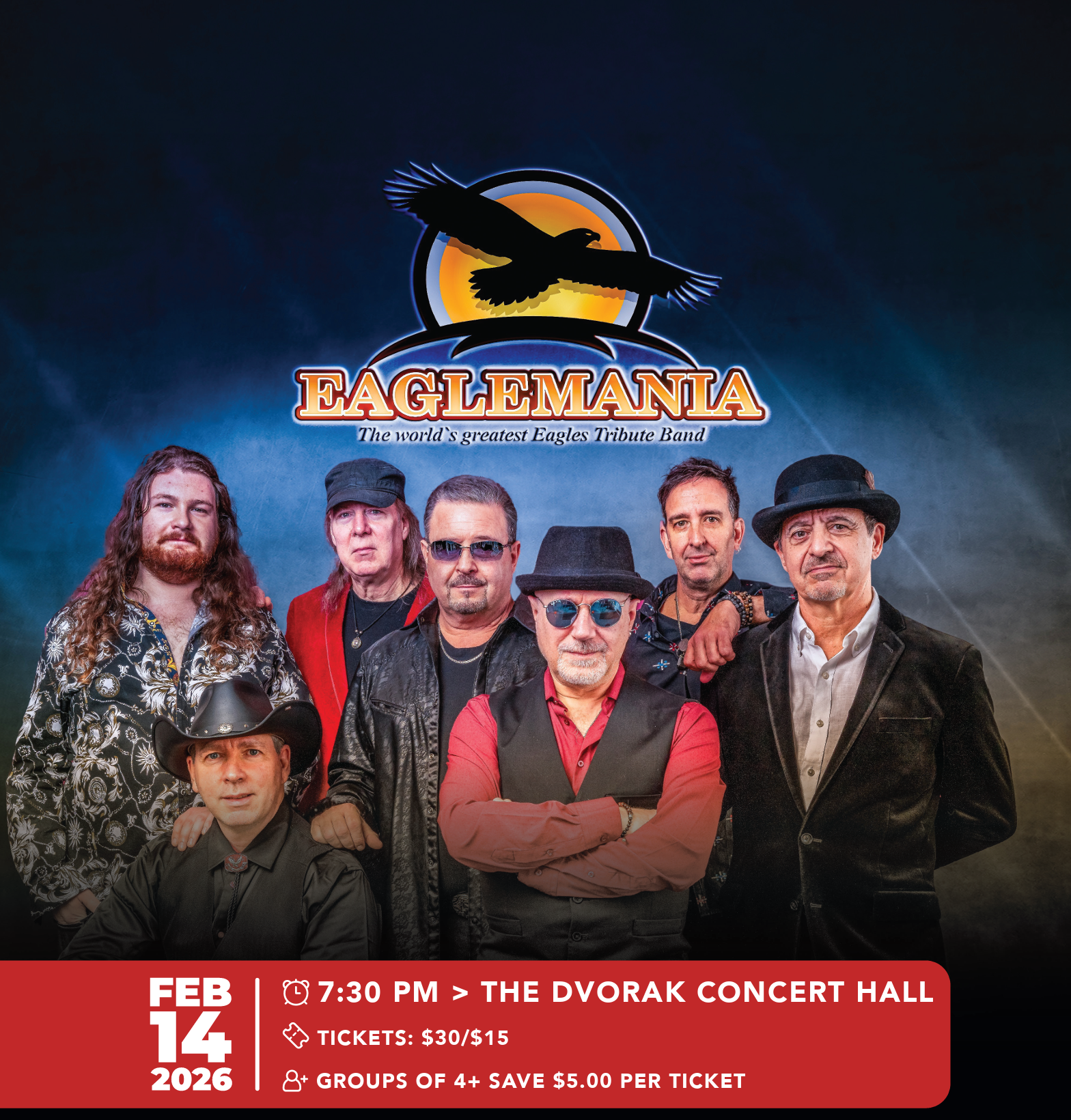 EagleMania has been dazzling audiences for over a decade by spectacularly reproducing the music of The Eagles. EagleMania thrills internationally sold-out audiences with their stunning five-part harmony, virtuoso guitar work and uncanny ability to emulate the distinct sound of The Eagles. The EagleMania show consists of the Eagles’ greatest hits, as well as select Don Henley, Glenn Frey, and Joe Walsh solo efforts.