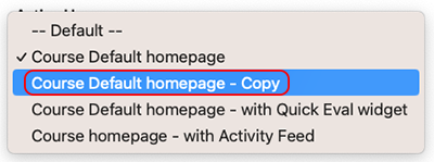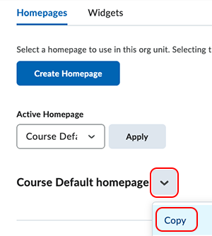 - You cannot modify the default course homepage so you will need to make a copy. Select the down arrow to the right of Default Course Homepage then select Copy.