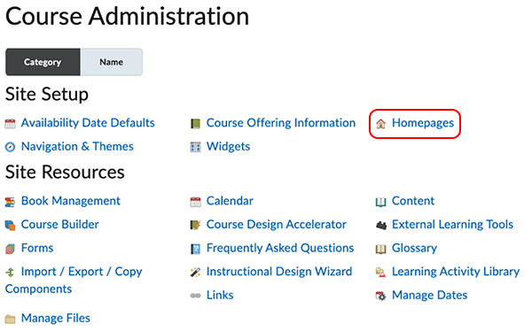 - On the Course Administration page, select Homepages listed under Site Setup.