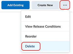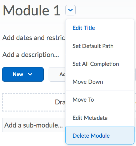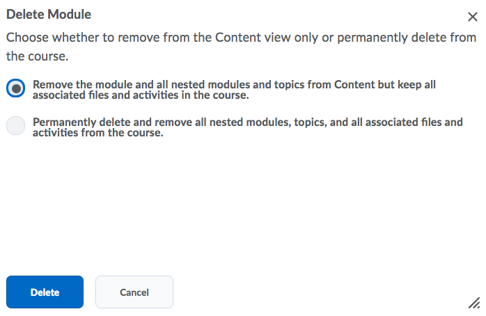 - Make a selection if you want to remove the links to the content within the module or if you want to permanently delete the files and activities within that module from the course, then, select Delete.