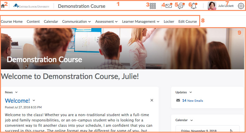 The following common interface elements help you navigate the D2L Brightspace Learning Environment.