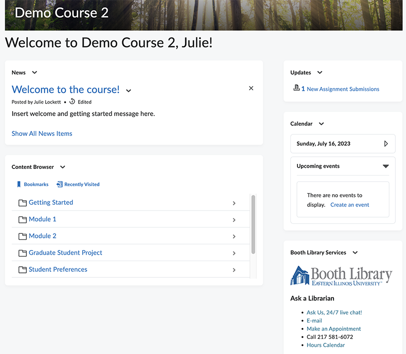 The Course Homepage provides quick access to important information related to the course. Information is displayed in the form of widgets. The widgets contained on the default course homepage include the News (announcements) widget, Content Browser, Updates widget, Calendar widget, and Booth Library Services. Pictured below is the default course homepage for a sample course as it would appear to the instructor. The instructor has the option to modify the course homepage as needed.