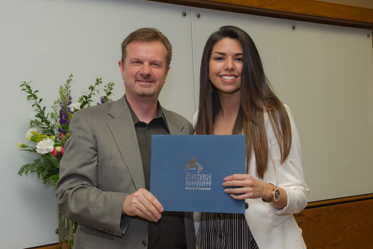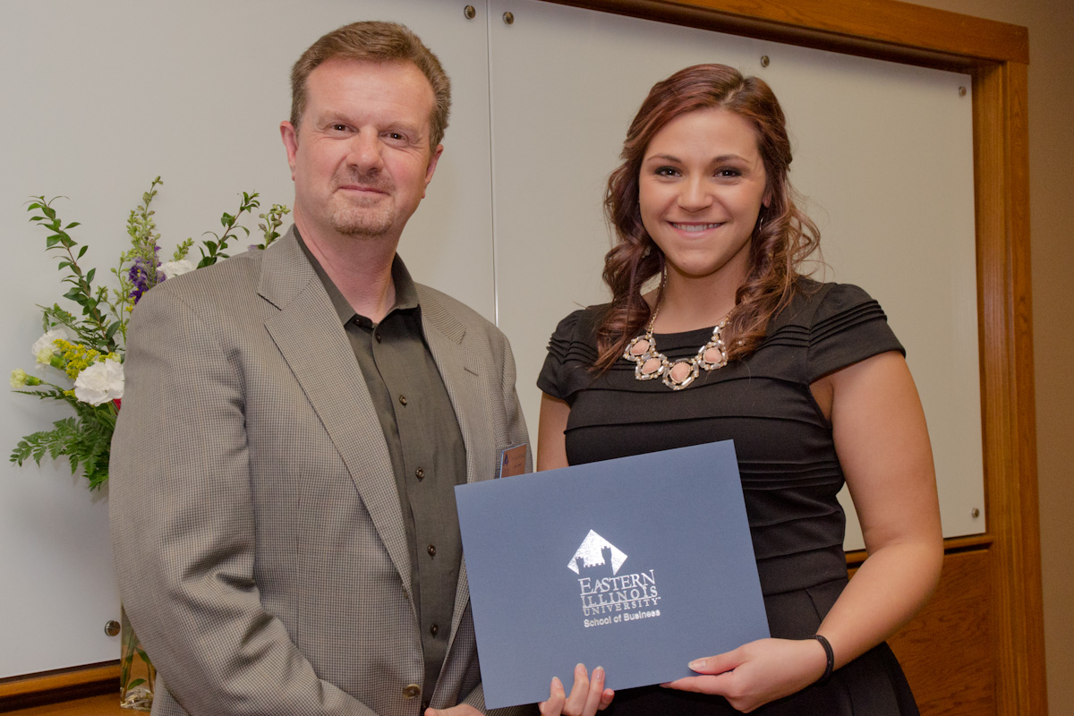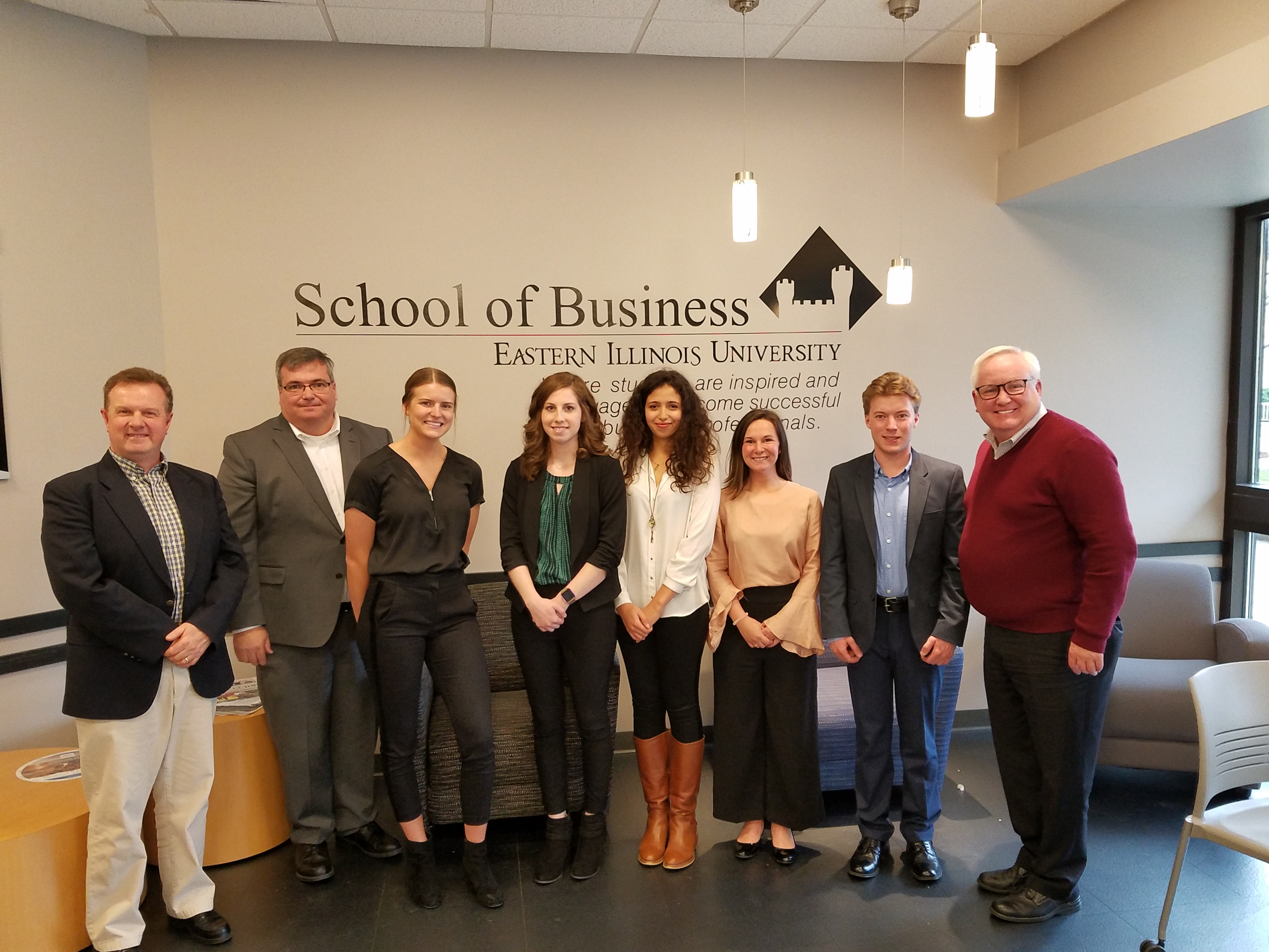 Pictured from left to right: Dr. Marko Grünhagen, Coordinator of the ENT Minor; Mr. Rance Higgins, Community Bank President, First Mid Illinois Bank & Trust; Ms. Morgan Dolehide (3rd Place); Ms. Baylie Painter; Ms. Yasmine Ben Miloud (1st Place); Ms. Emily Ashby (3rd Place); Mr. Bryce Trayor; Mr. Bill Skeens - Award Sponsor & President, Prairie City Bakery