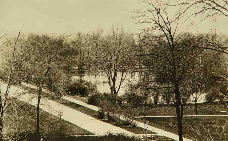 The lake as seen from the Botany Laboratory in April, 1919. On the west side of the campus along Fourth Street, this is Lake Ahmoweenah, it was not as big as the funny little plans I showed you earlier, but this is Lake Ahmoweenah. And this road just touches the west end of Old Main going straight south. And this sidewalk goes straight south down yonder to Schahrer Field. This is a cottonwood tree. See that cottonwood tree? Ready?