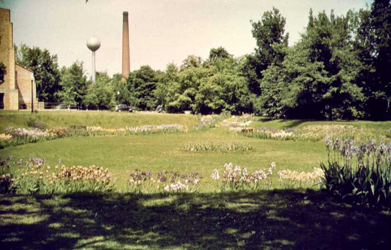 Sunken Garden. A sunken garden took up the south part of the old lake site. South of McAfee Gym, even when Lake Ahmoweenah was filled up, there was this low spot and in this low spot Dr. Buzzard put his extra iris so we had an iris garden over here, just south of McAfee gym.