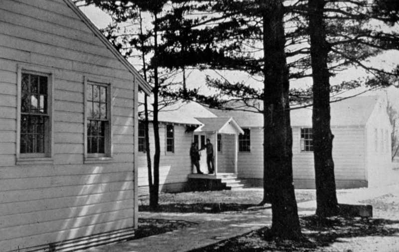 Cafeteria, ca. 1943. [We are] facing east and looking through the two trees at the temporary building which housed the cafeteria. This slide was made from a picture taken about 1943. They taught Geography, especially Psychology, some language and some other things in this building. Now these three trees here, I went by this spot one day and saw Mr. Monere who was grounds keeper at that time. I said, "Mr. Monere, what do these stakes mean over here?" "Oh, we're going to put a temporary building in here." "What are you going to do with these trees?" "Well," he said, "I guess we'll just have to cut them down." I said, "You go and tell Dr. Buzzard to move the building ten feet. And you say I said so." Well, he went to see Greg the business manager and Greg said, "Well, you better see Dr. Buzzard." And, sure enough---they moved the building 10 feet! And, we saved the trees! Thank goodness! Some times you have to be obstinate to get your wish.