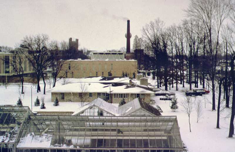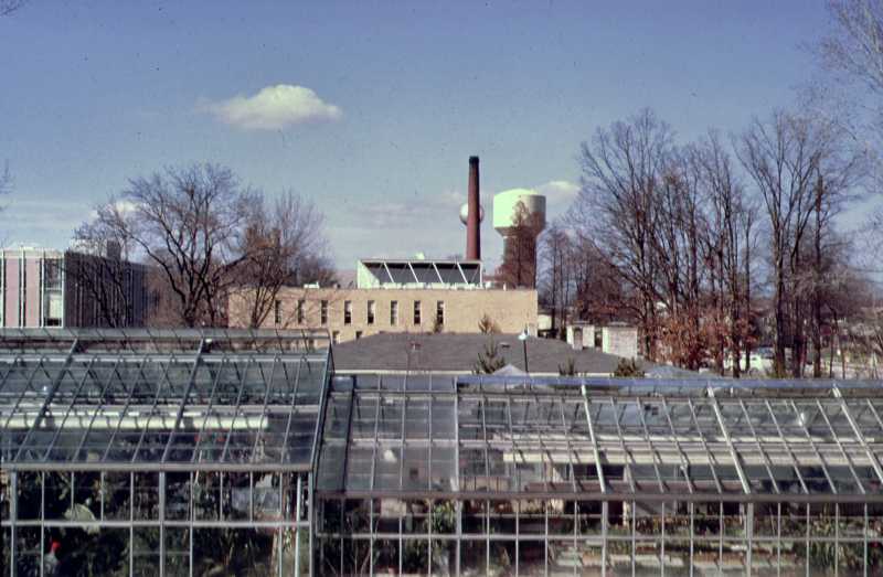 Looking north toward the powerhouse in February, 1966. In time, between the chimney and the practice houses, they built this Music - Art complex. So here we have the practice houses and the greenhouses, taken from the Life Science Building. That's the water tower. Now, I want you to watch the water tower ‘cause it grows rapidly.