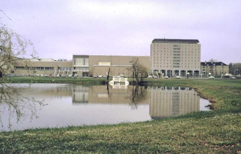 University Lakes in September, 1973. Since Lake Ahmoweenah was a lake and it was kind of low they had to have some earth so they went down across Fourth Street and had earth "gulpers", earthmovers, pick up earth, so Lake Ahmoweenah up there disappeared but the campus lake appeared. And, they not only more or less closed up the lake but also made other changes of the topography of the campus. This is the lake as you all should know.