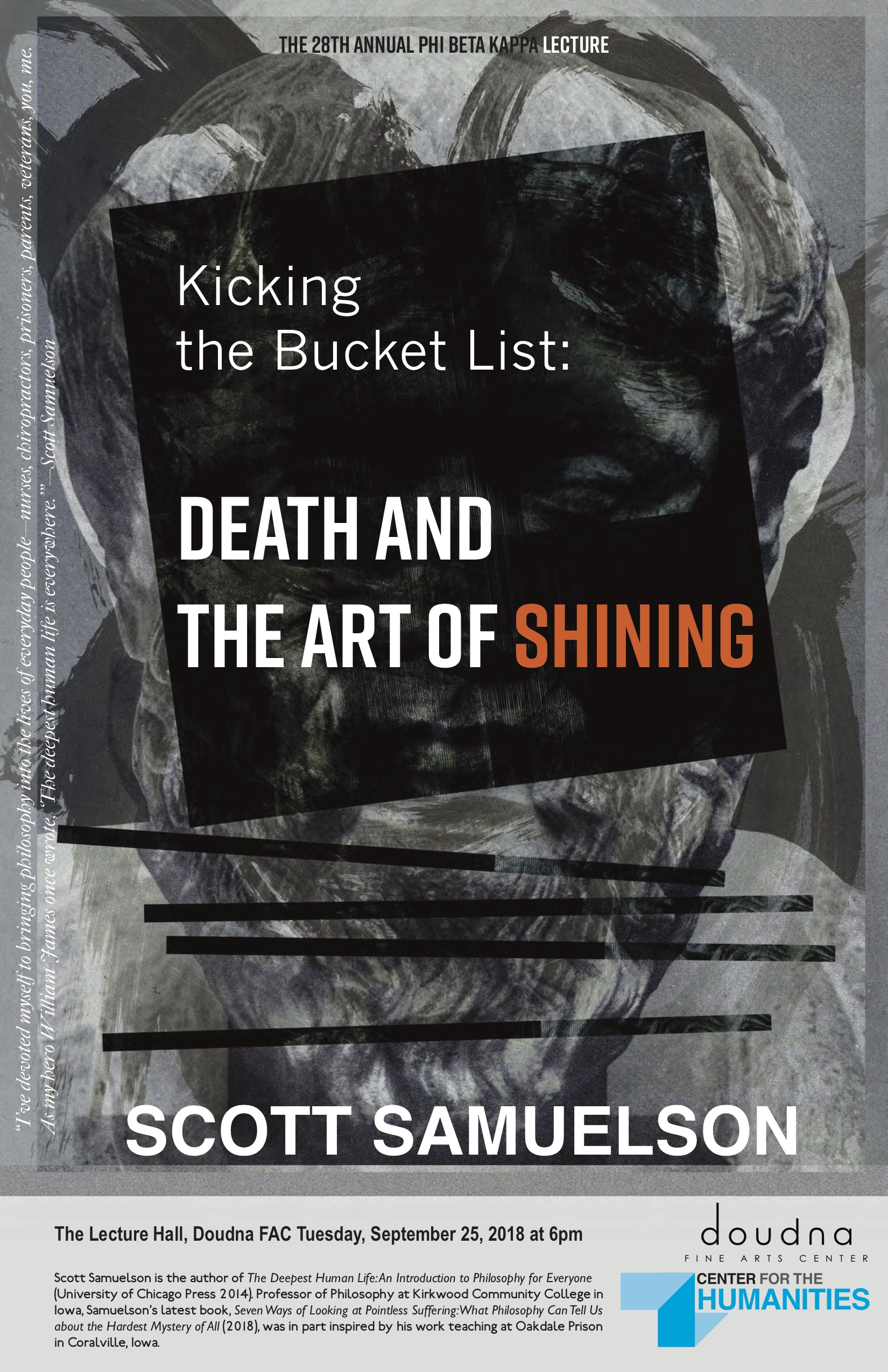 On September 25, 2018 at 6pm, Scott Samuelson presented The 28th Annual Phi Beta Kappa Lecture,"Kicking the Bucket List: Death and the Art of Shining" in the Lecture Hall of the Doudna FAC.