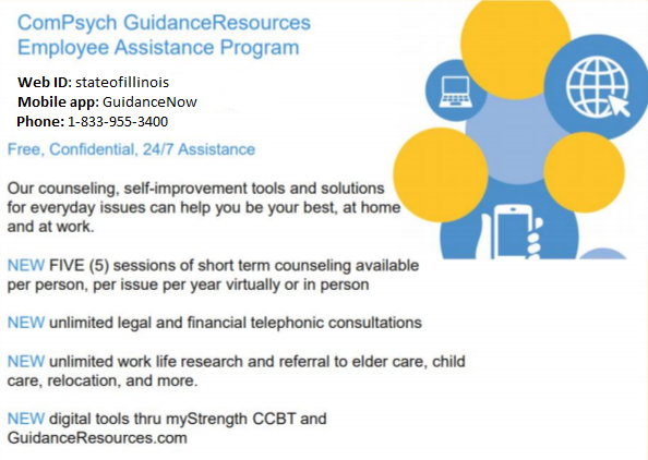 At this time, I encourage everyone to register at www.guidanceresources.com and the ID is: stateofillinois. Explore all of the life assisting programs, webinars, and resources that ComPsych has to offer. The service is confidential, free and available for any employee and their dependents.