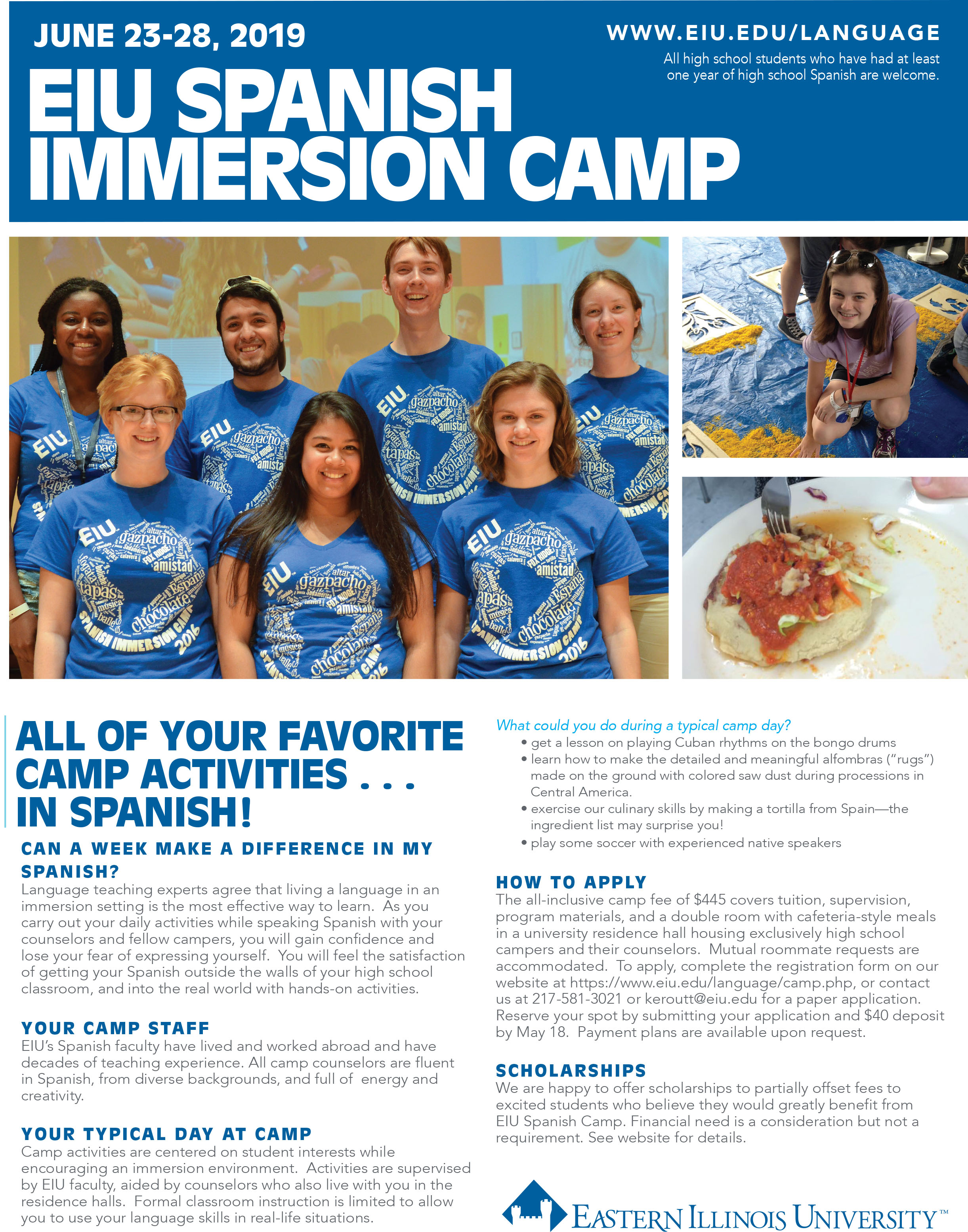 What would YOU like to do during your residential summer camp experience? Play some soccer or basketball? Do some arts and crafts? Cook a new dish? How about doing all of these fun activities in Spanish while living on a college campus? Join us June 23-June 28 for a week of Spanish language immersion and cultural experiences you will never forget on the campus of Eastern Illinois University in Charleston, Illinois! All students who will be in the 10th, 11th, or 12th grade in fall 2019 and who have had at least one year of high school Spanish are welcome.