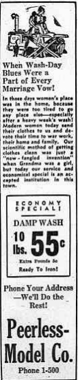 This ad from December 5, 1943 belittles the wash chores of earlier decades and asks modern women to free themselves from the senseless chore of manual laundry.