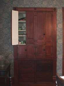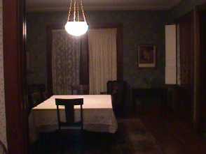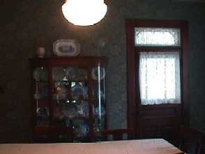 The dining room is situated between the kitchen, the back parlor, and the hallway. It has a beautiful glass buffet. It also contains built-in cupboard connecting to the kitchen.
