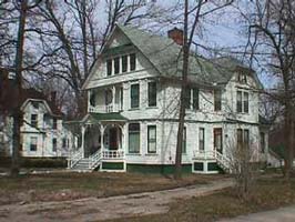 The Dudley House irregular floor plan with projecting gables and bays. These are features of Queen Anne Revival architecture. One of the most distinctive features of the house is the quarter circular wraparound entrance porch on the first floor. This porch was once enclosed. The second story porch is recessed under the gable on the west side. The house features well proportioned and executed milled trimwork and rounded corners.
