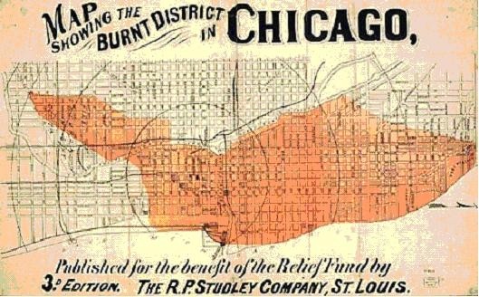 Figure 1: Map showing the effected areas of downtown Chicago. Photo taken from The Great Chicago Fire and Web of Memory website.