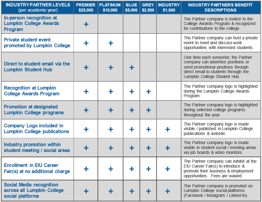 The Industry Partners Program connects companies seeking new talent in business and technology fields with Lumpkin College students. These connections will improve the channels for partner companies to reach talent, whether for internships or full-time positions. In addition, it supports the personal growth and professional development of our students by providing an increased number and depth of touch points with practitioners. Finally, the program is integrated with EIU’s Career Services to provide a seamless system for reaching students. There is sure to be a partner level below that best meets the needs of your company!