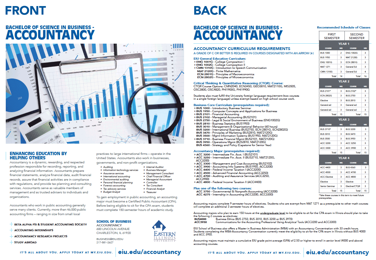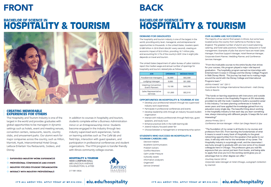 The Program Sheet is a recruiting tool that serves to showcase an individual program or department. It features a large photo and content related to the degree or program. These are often used for new student recruiting and serve to develop interest while directing the reader to the departmental or program website for more information.