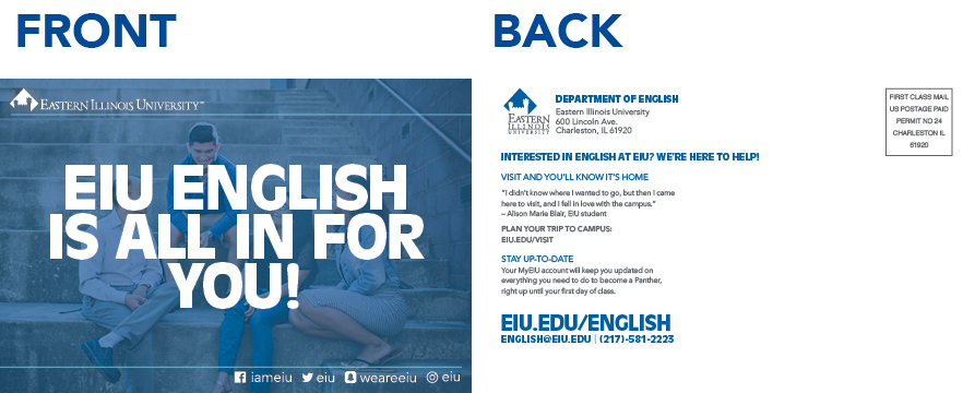 The Program Postcard is a simple way to reach out to prospective students for the first time or to follow up with prospective students who have asked for more information. The postcard is meant to encourage the prospective student to contact the department and visit the departmental website for more information.