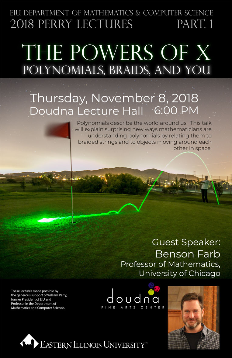 | Nov. 9 | Benson Farb (UC) | Perry Lecture: Braids, Polynomials, and Hilbert's 13th Problem |