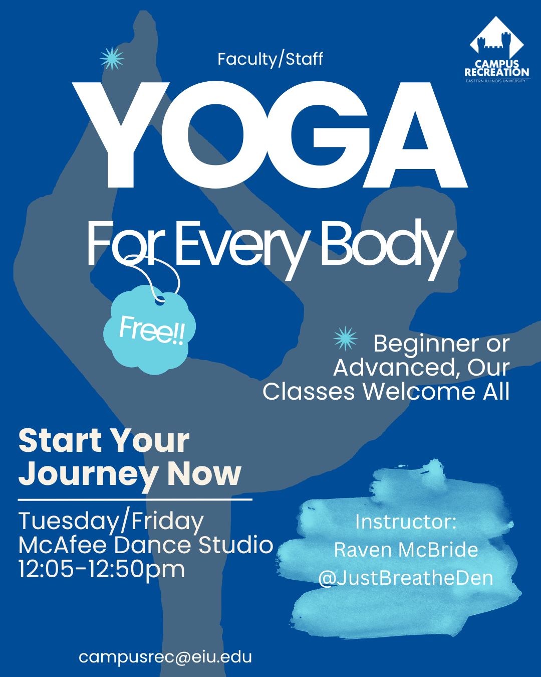 Join us on Tuesdays and Fridays at Noon for Yoga for Every Body! No experience necessary, all skill levels welcome, just bring a mat. If you don't have a mat we have some extras to share. What a a great way to kick off those New Year's resolutions!