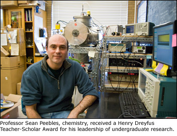 McGuire, whose office sits next to Peebles', nominated his colleague for the Dreyfus Award based on what he had observed since Peebles came to Eastern in 2001. In addition to what he has seen as exemplary interaction between Peebles and his students, McGuire also saw dedication, ingenuity and passion when it came to research.