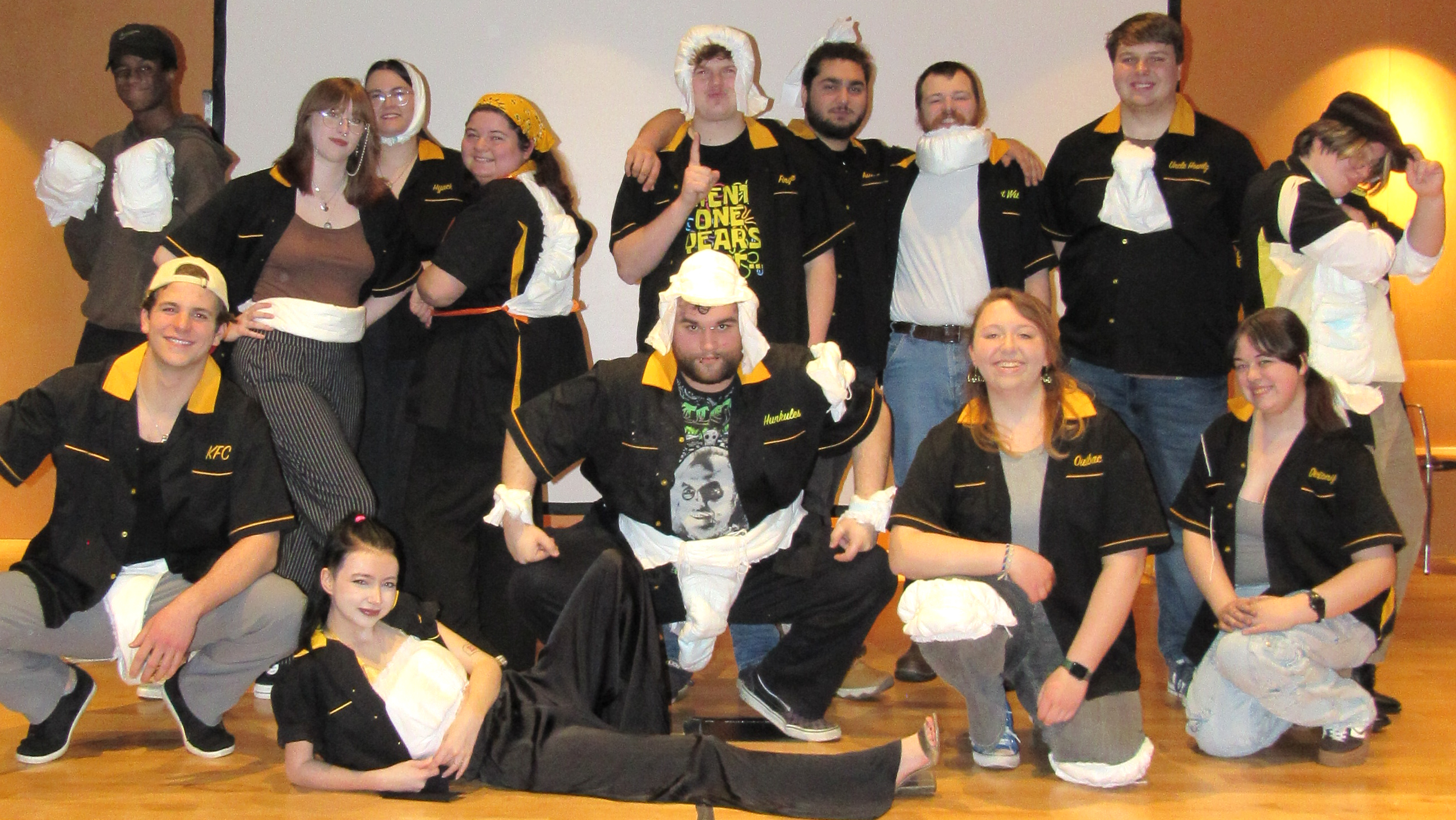 Members of EIU RSO’s Hello Dali Improv Comedy Troupe, adorned here with “absorbent accoutrements” before one of the group’s themed shows earlier this March. Members of Hello Dali are eager to provide laughs, spontaneity, and pure theatrical fun at the troupe’s remaining improv shows this spring on EIU’s Charleston, Illinois campus. Pictured here are current Hello Dali members (back row from left) Zack Evans, Hello Dali president Charlie Stauffer, Evelyn Bogard, Jo Mitchell, Tim Anderson, Michael Fellows, Brenden Cash, Hello Dali treasurer Ethan Lane, and Jay Larson; (front row from left) Mitch Cox, Hello Dali vice president Azlynn Padderatz, Myles Wright, Hello Dali secretary Abby Hill, and Hello Dali social media manager Olivia Keys. Fox Woods, not photographed, is also a part of the active lineup.