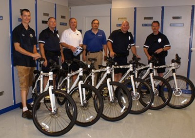 Keith Cox, general manager of Bike and Hike in Charleston, described some of the features of the new patrol units. "They have a lightweight aluminum frame, disk brakes for better riding in all conditions and a suspension front end. It's faster than a normal mountain bike."