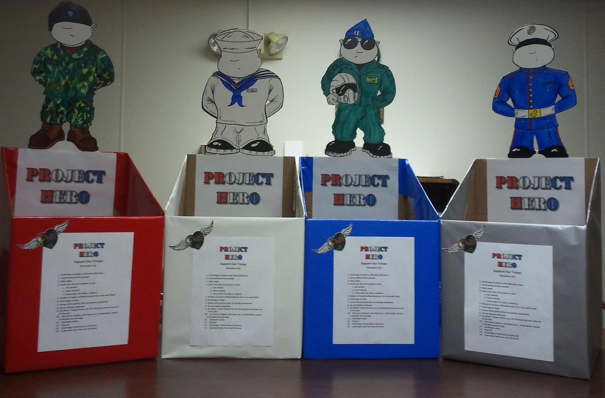 | These collection boxes, designed by Michael Ruybal, stand awaiting donations from area residents for Project Hero. The boxes can be found at Rural King, Wal-Mart, Starbucks and in Old Main (the "Castle") on EIU's campus. |