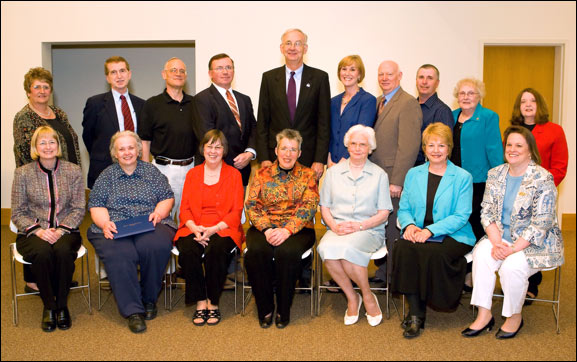 A celebratory dinner was held April 30. Those attending were, from left to right, front row -- Joy Craft, Vesta McLain, Barbara Powell, Martha Brown, Marilyn Klingenberg, Jan Hinkle and Pat Beaulieu; second row -- Doris Hamilton, Michael Chron, David Horsman, Daniel Carpenter, EIU President Bill Perry (on hand to congratulate the retirees), Julie Sterling, Russell Fischer, Terry Coffey, Norma Taylor and Vickie O'Day.