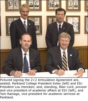Present for the signing were Robert Exley, president, and Tom Ramage, vice president for academic services, representing Parkland; and Lou Hencken, president, and Blair Lord, provost and vice president of academic affairs, representing EIU.