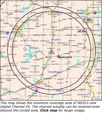 To accommodate the digital conversion, WEIU upgrade its 200-foot tower by building a 500-foot tower near Humboldt, about 10 miles northeast of EIU. The taller tower allows the signal to reach a larger geographic area.