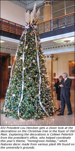 “Homegrown Holiday,” this year’s theme for EIU’s annual community/campus holiday parties, will feature décor made from various plant life found on the university’s grounds. Grasses and pinecones, twigs and leaves. . . Even hydrangeas and brightly colored hot peppers will be found adorning the wreaths, tree limbs and tables of the 2005 festive gatherings.