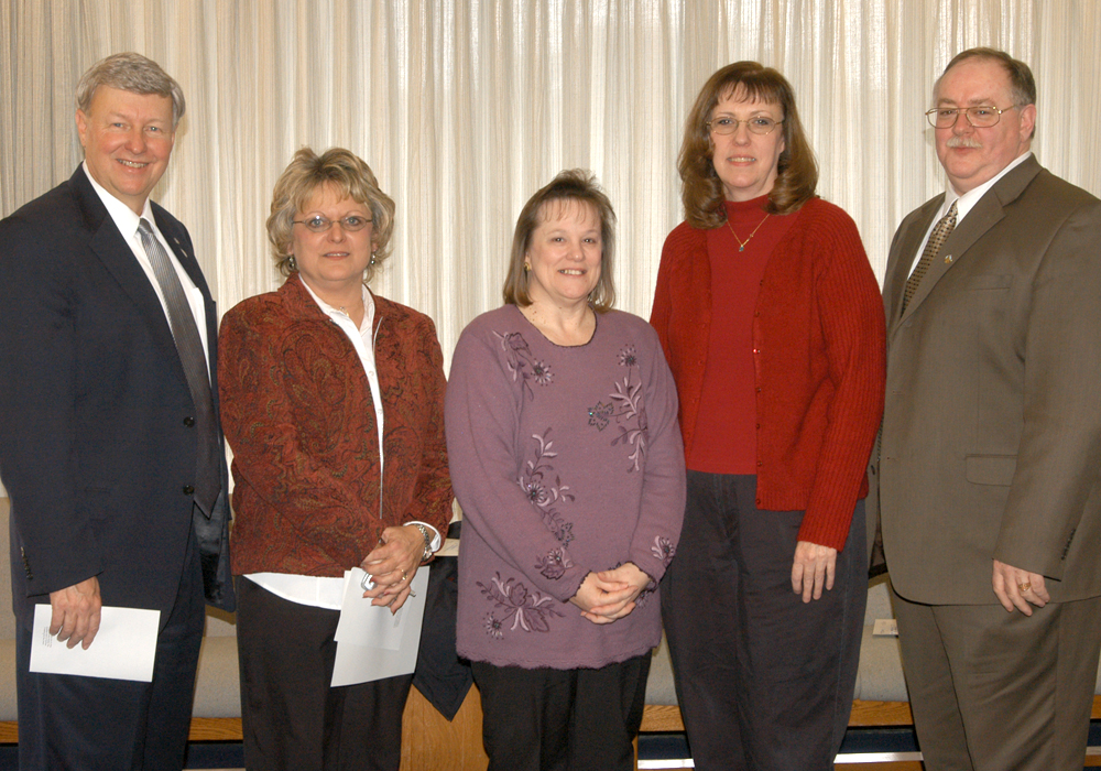 Shown, from left to right, are EIU President Lou Hencken with Debra Bosler, Patricia Beaulieu, Debbie Gerdes and J. Sain. Bosler, Beaulieu, Gerdes and Sain were honored for 30 years of continuous service to EIU.