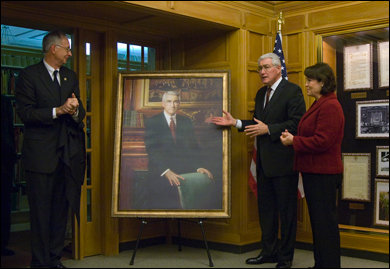 Perry also presented a gift to the Edgars: a reproduction of Edgar's official portrait that hangs in the Illinois State Capitol's Hall of Governors.