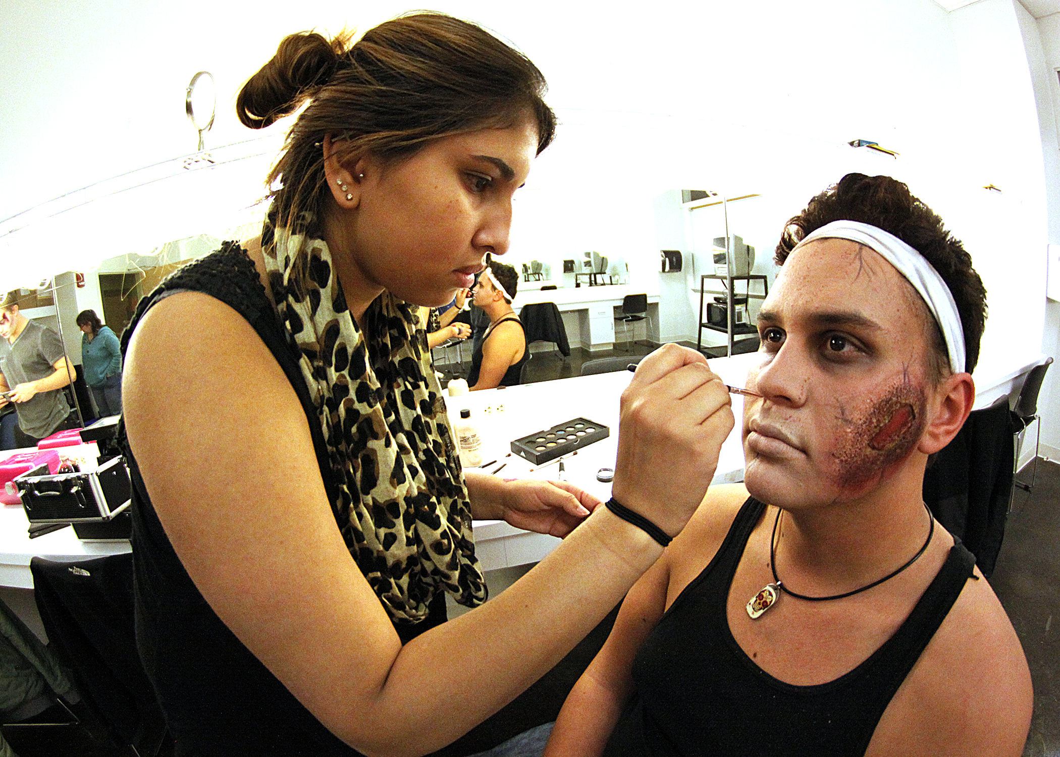 Chela Gurnea, an Eastern Illinois University student, places the final touches of the adult zombie look to fellow student, Austin Scavone. |