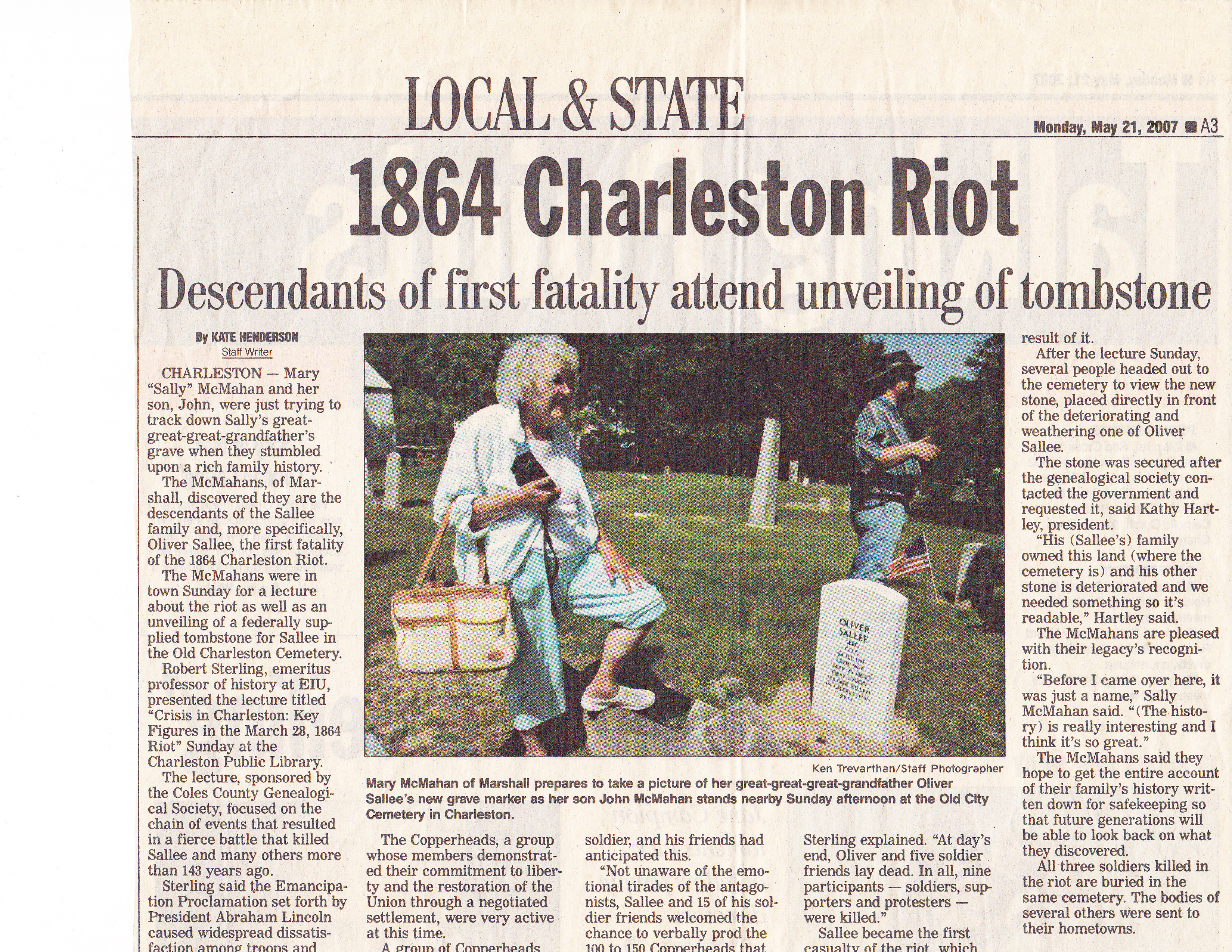 - Citation: Henderson, Kate. "1864 Charleston Riot: Descendant's of first fatality attend unveiling of tombstone." From the Times Courier, May 21, 2007.