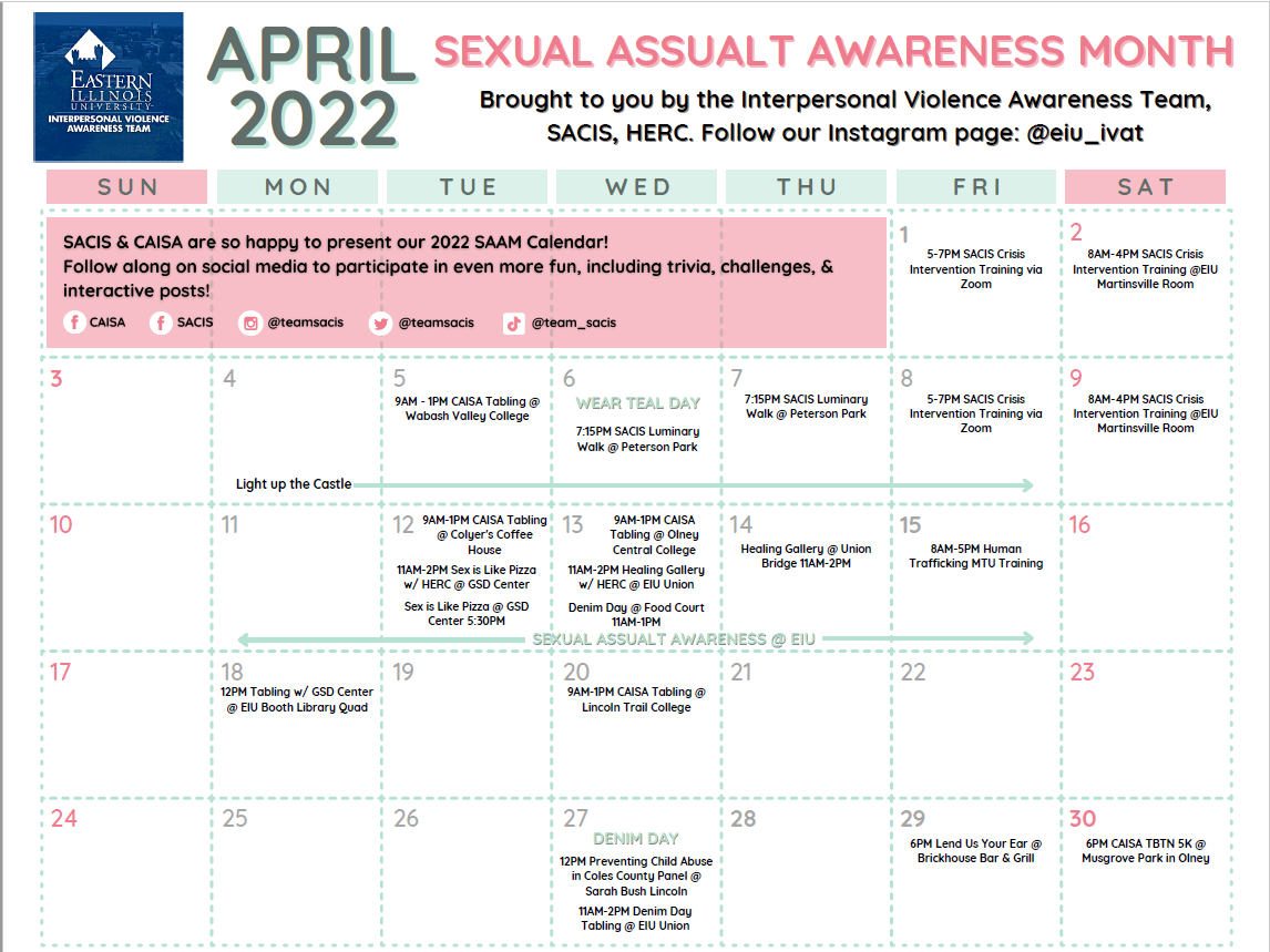 The Interpersonal Violence Awareness Team (IVAT), previously known as the Sexual Violence Prevention Team, is a multi-disciplinary team representing Student Affairs, Academic Affairs, and community partners. Through outreach efforts, the team works to educate EIU’s campus on interpersonal violence and share related resources. On our website, you will find links to outreach programming, reporting options, campus policies & procedures, and much more.