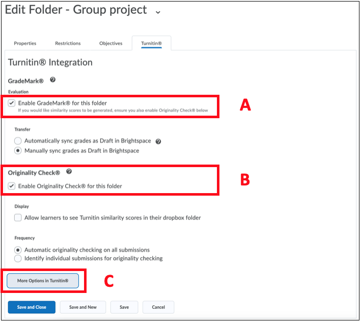 Select Enable Online Grading for this folder if you want to use the Turnitin suite of feedback and grading tools. If you will be using the grading tools from the Assignment Dropbox in D2L, you do not need to enable online grading for Turnitin.