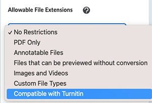 Under Allowable File extensions, select Compatible with Turnitin. For more information, refer to File Types supported in Turnitin.