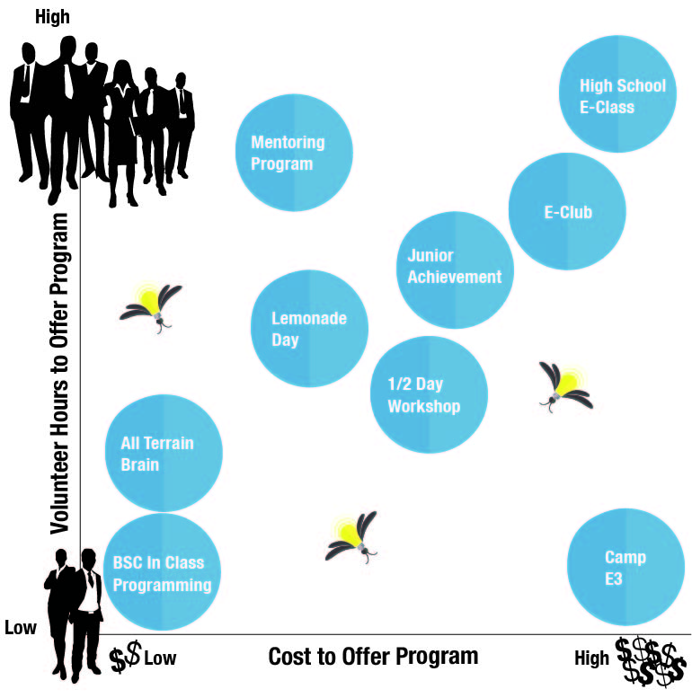 Every school or community has its own unique strengths and resources and these should be considered when deciding which program is right for you. This graph shows the relationship of the programs based on the cost to offer the program and the number of volunteer hours it takes to facilitate the program. Many times communities begin with the in-class programming, workshops, and sending students to camp; then they build up support to tackle the more complex programs.